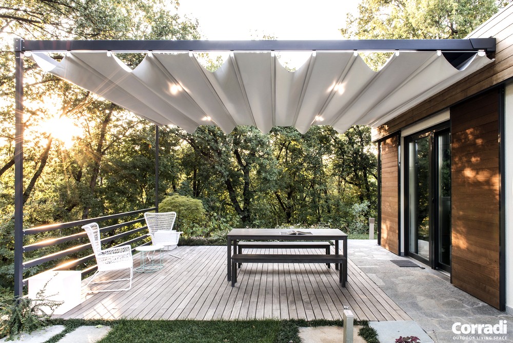 Pergotenda® Corradi è il sistema brevettato di copertura scorrevole a impacchettamento, che coniuga materiali innovativi, tecnologie d’avanguardia e design ricercato per proporvi un’ampia gamma di prodotti.